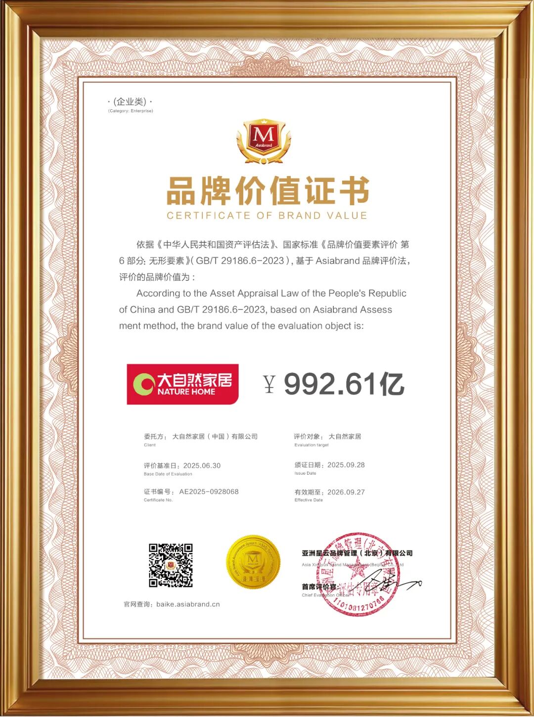 2025年9月27日-28日,由專(zhuān)業(yè)品牌評(píng)價(jià)機(jī)構(gòu)Asiabrand發(fā)起主辦,中國(guó)亞洲經(jīng)濟(jì)發(fā)展協(xié)會(huì)、一帶一路總商會(huì)、東盟-中國(guó)工商總會(huì)和亞太第一衛(wèi)視聯(lián)合主辦,被譽(yù)為亞洲品牌界年度“奧斯卡”的第20屆亞洲品牌盛典在中國(guó)香港舉行。 此次盛典上,大自然家居比肩一眾全球頂尖品牌,再次問(wèn)鼎“亞洲品牌500強(qiáng)”,獲評(píng)“亞洲(行業(yè))十大領(lǐng)軍品牌”和“亞洲(行業(yè))消費(fèi)者信賴品牌”,品牌價(jià)值躍升至992.61億。這是大自然家居自2018年登榜后,蟬聯(lián)上榜的第8年。